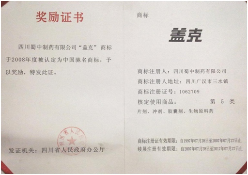 公司高度重视品牌战略,依法注册了“盖克”、“蜀中”、“三星堆”、“阿莫锋”、“益善源”、“蓉通”、“尊龙凯龙时官网进入网页”等108件注册商标,1999年“盖克”、2003年“蜀中”、2007年“三星堆”被认定为德阳市知名商标,2001年“盖克”、2004年“蜀中”被认定为四川省著名商标, 2008年“盖克”商标被国家工商行政管理总局认定为“中国驰名商标”。2017年3月,公司盖克牌、尊龙凯龙时官网进入网页牌阿莫西林胶囊和多酶片被四川省人民政府授予四川名牌产品称号。2016年,公司实现营业收入66373万元,利税7600万元;2017年,公司实现营业收入75045万元,利税7572万元。公司2017年被命名为德阳市第七批院士专家工作站,2016-2018连续三年被德阳市人民政府确定为重点龙头企业。